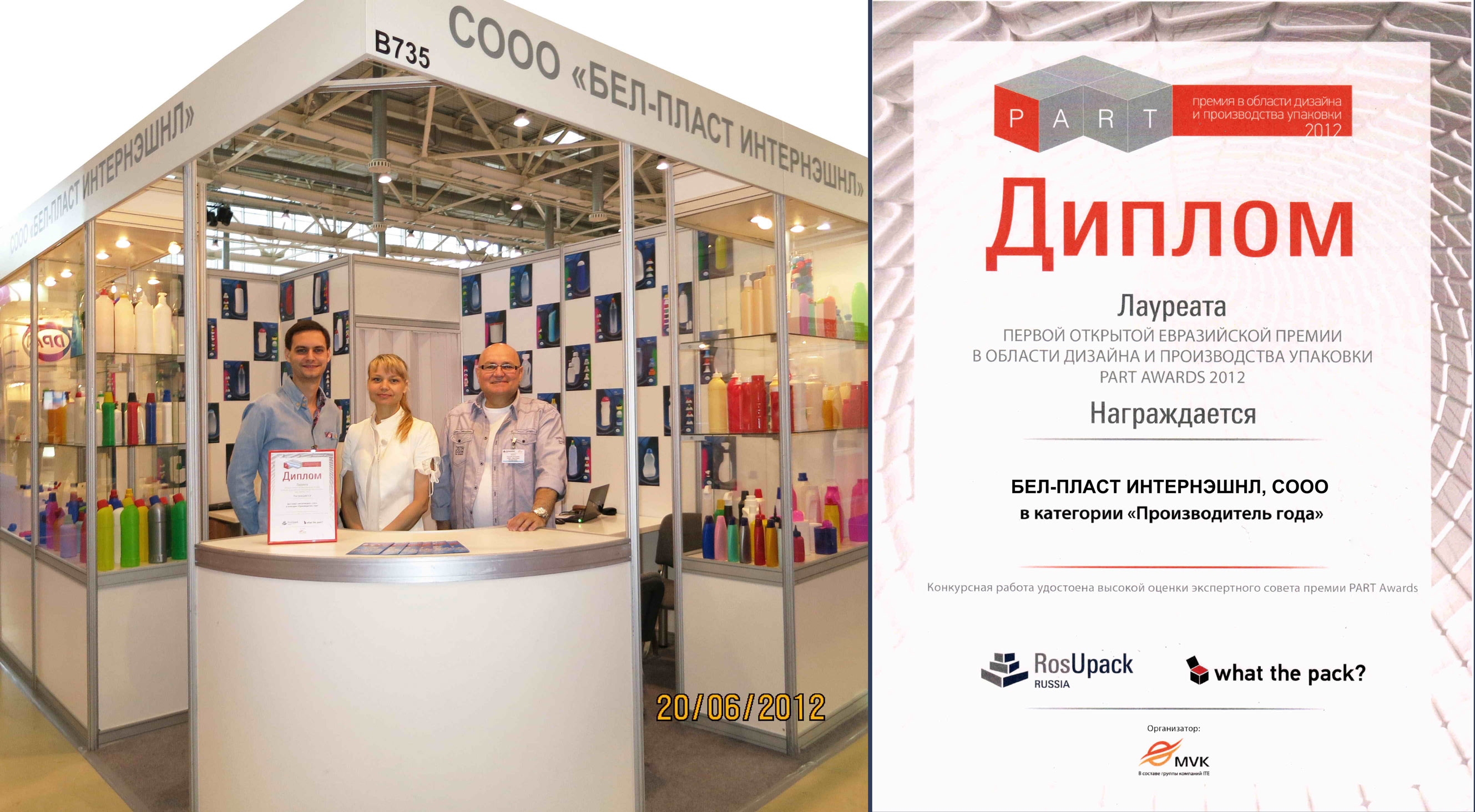 Every year JC "Bel-Plast International" Ltd. takes part in the largest international exhibition of packaging “Rosupak” that is held in Russia, Moscow. This year there were more than 700 participants from 31 country of the world. The contest “PART. Packaging: Art, Research, Technology” for the best packaging was held during the exhibition. The jury of the contest was made up of directors of International and European packaging organizations, representatives of universities and specialized NII, competent and independent experts of packaging business, Media Representatives, designers, leading representatives of the packaging industry. A very important point - the independence of the expertise. The jury evaluated the packaging samples in each nomination without the information about the producer / the author of packaging. Only objective measures, namely, the properties and quality, description and depictions, technological solutions etc. served as a criteria for selecting candidates for the prize category. JC "Bel-Plast International" Ltd. has won a diploma of the laureate of the First Eurasian Open Award in the field of design and manufacture of packaging. Competitive work provided by the company was awarded with the high opinion of the Expert Council of the Prize.