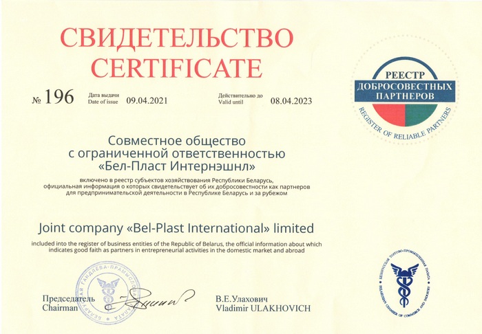 JC "Bel-Plast International" Ltd. is included in the Register of conscientious partners of the Republic of Belarus. Certificate No. 196 dated 09.04.2021.