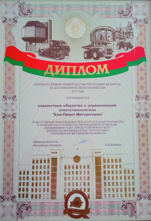 On June 6, 2018 at the National Library in Minsk, JC "Bel-Plast international" Ltd. was awarded a diploma of the laureate of the Prize of the Government of the Republic of Belarus for achievements in the field of quality in 2017. Since 2007 the company is the laureate of this prestigious competition, and constantly confirms this title for more than 10 years. As Deputy Prime Minister Vladimir Semashko noted, the winners were organizations that created efficient production of goods and services, modern management systems and highly efficient business processes that have achieved business excellence and consumer recognition.