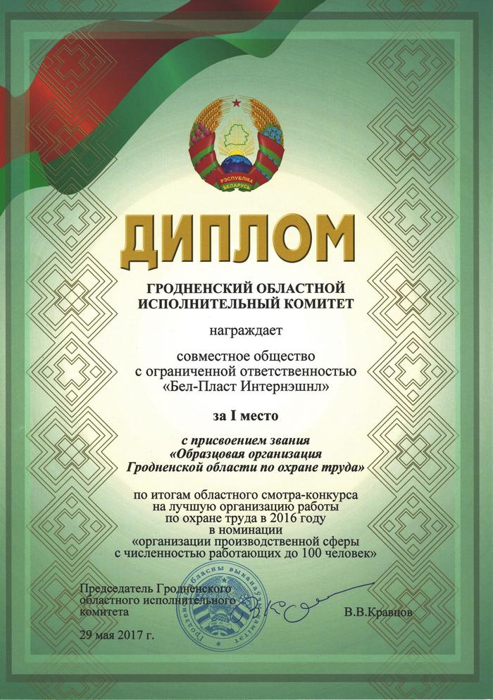 By the end of 2016, the JC "Bel-Plast International" Ltd. took the first two places in the annual regional and district review competition for the best organization of work on labor protection in the category "organization of the production sphere with the number of employees up to 100 people." The enterprise was given the title of "Exemplary organization of the Grodno region on labor protection" with the presentation of the diploma and monetary compensation.