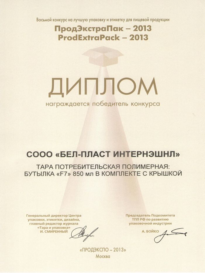 JC “Bel-Plast International” Ltd. became the winner of the VIII-th International Contest for the best packaging and label for foodstuffs “ProdExtraPack-2013”. The award was given to the factory in the nomination “Packaging”. At the Contest it was presented a new product the bottle “F7” 850 ml with the cap that is used for ketchup, mayonnaise, fruit sauces, mustard, flavorings, syrup, fillings and other foodstuffs. It was the first International Contest where the product was presented. And immediately a success.