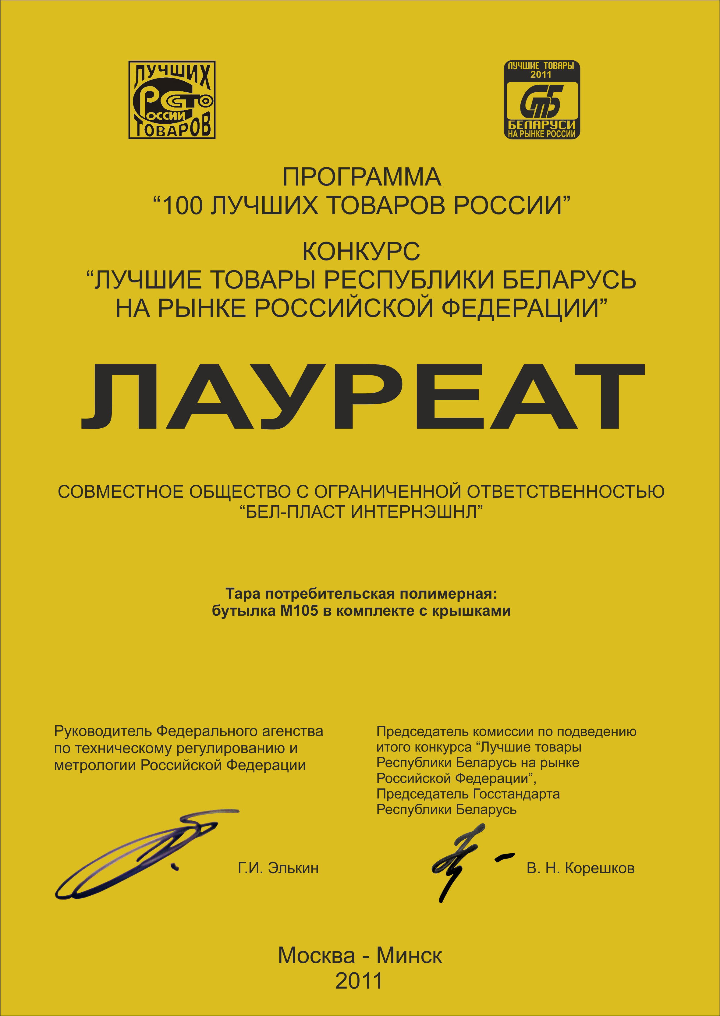 18.08.2011 the products of JC “Bel-Plast International” Ltd. consumer packaging polymer the bottle M105 with the cap was awarded with the diploma of laureate of the competition “The best goods of the Republic of Belarus on the market of Russian Federation”. JC “Bel-Plast International” Ltd. is a laureate of the competition “The best goods of the Republic of Belarus” for 8 years on end (from 2004 till 2011).