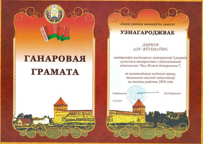 A solemn event was held on February 15, 2019 in the Palace of Culture. It was dedicated to summing up of the basis of work in Lida region for 2018.There were named the best labor groups and the best workers in various industries. Alla Dirbuk, controller of polymer materials of the 4th category of JC "Bel-Plast International" Ltd. was awarded the Certificate of Honor of Lida Regional Executive Committee for many years of diligent work and the achievement of high performance in the work.