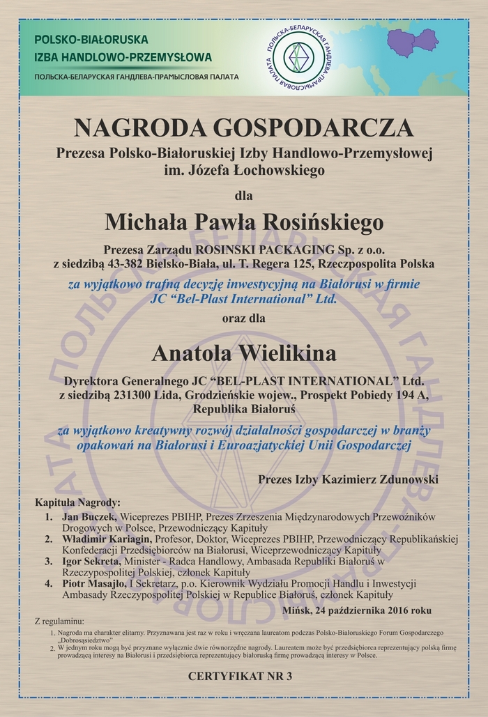 Anatoly Velikin General Director of JC "Bel-Plast International" Ltd. took part in the XX Belarusian-Polish Economic Forum "Neighborhood 2016" which was held on the 24th of October, 2016 in Minsk. The forum was attended by over 500 representatives of Belarusian and Polish business, bodies of public administration, diplomatic corps, business associations, the leading media of the two countries. There were discussed and considered questions of intensification investment and industrial cooperation; the agreements were signed on cooperation of Belarusian enterprises and organizations with Polish partners. The companies JC "Bel-Plast International" Ltd. and ROSINSKI PACKAGING Sp. z o.o. were awarded with Economic Award of the Chairman of the Polish-Belarusian Chamber of Commerce and Industry by name of Jozef Lokhovsky for especially creative development of economic activities in the packaging industry in Belarus and Eurasian Economic Union.