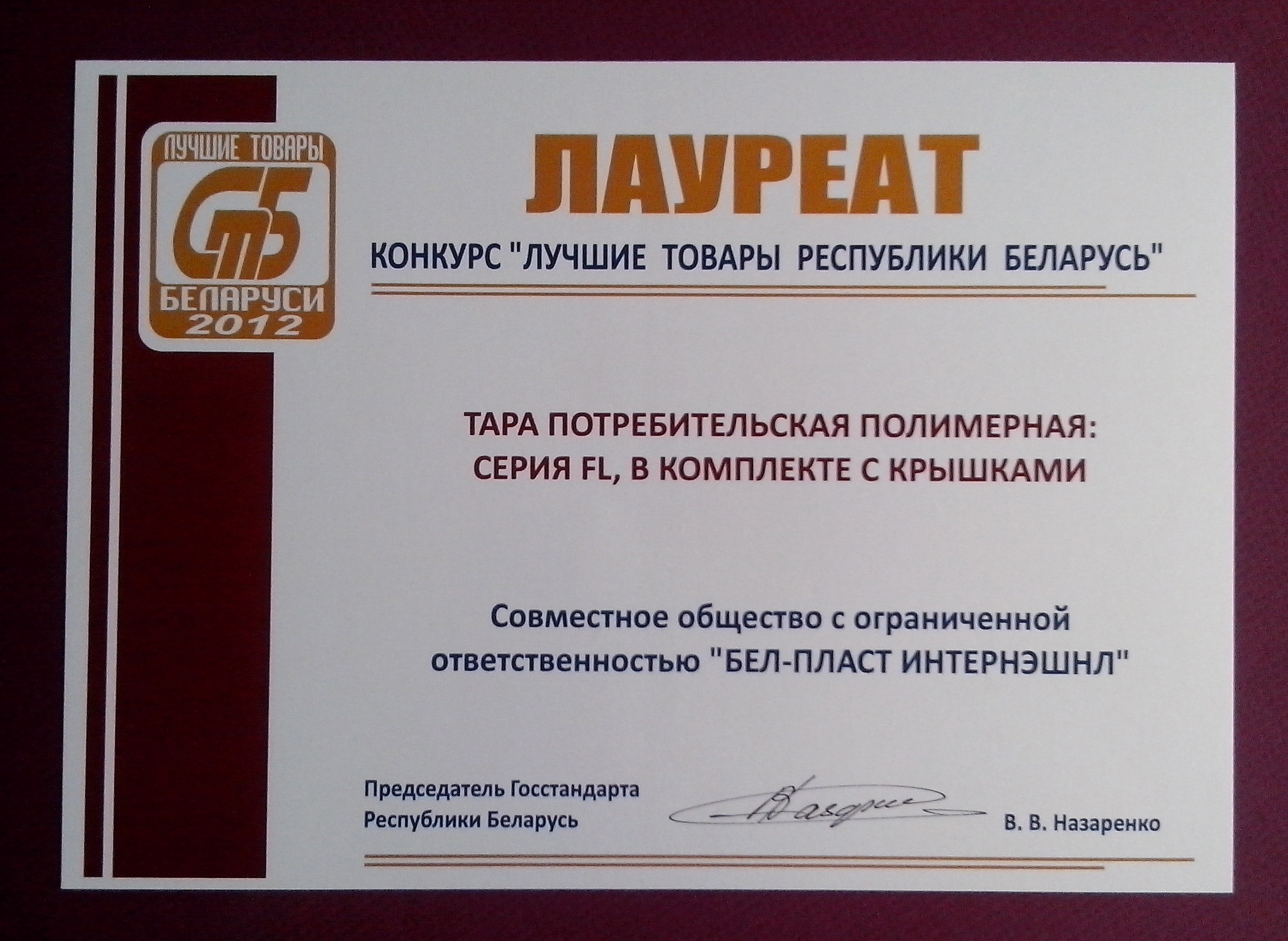 The companys products JC "Bel-Plast International" Ltd. - a series of consumer packaging polymer FL complete with lids awarded a diploma winner of the contest "Best Goods of Belarus".