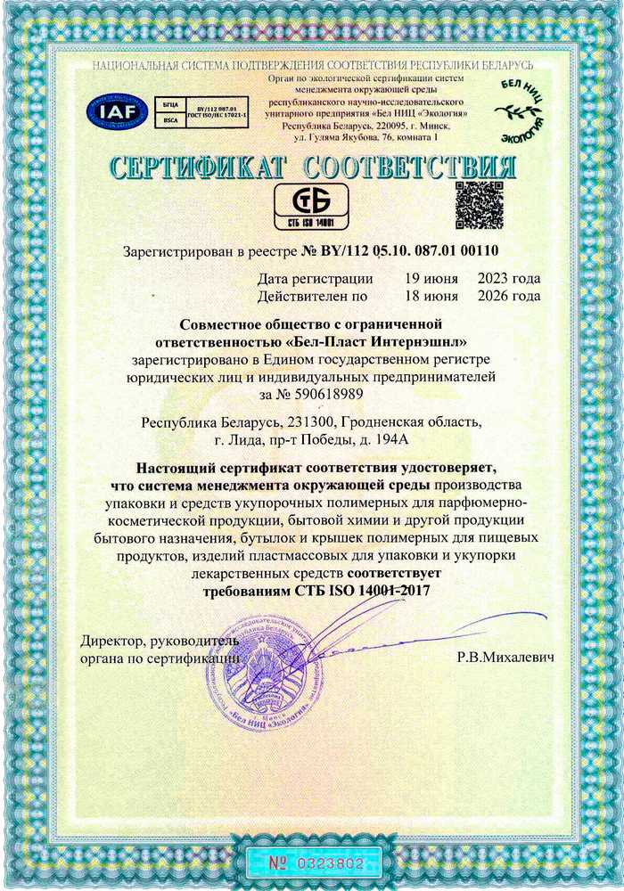 On May 30, 2023, at JC "Bel-Plast International" Ltd. the expert-auditor of the Republican Research Unitary Enterprise “Belarusian Research Center “Ecology” conducted a certified audit of the environmental management system for compliance with STB ISO 14001-2017.