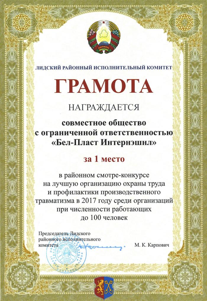Decyzją Lidzkiego Rejonowego Komitetu Wykonawczego JC "Bel-Plast International" Ltd. została wynagrodzona dyplomem za 1 miejsce w rejonowym przeglądzie-konkursie na najlepszą organizację ochrony pracy i zapobiegania wypadkom przy pracy w 2017 roku.