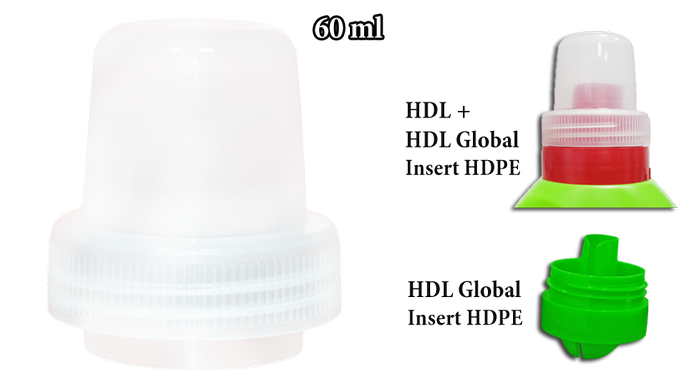 Dla wygody korzystania odżywek, płynów dla płukania i innych środków myjących nakrętka HDL może komplektować się złożoną częścią HDL Global Insert HDPE.