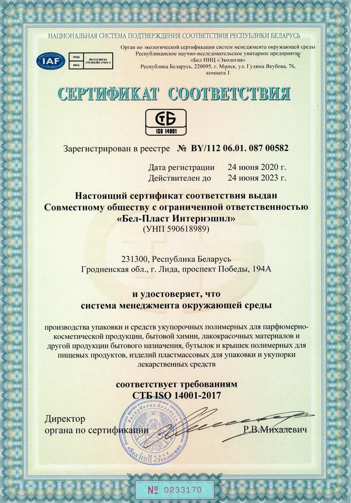 СООО «Бел-Пласт Интернэшнл» в очередной раз успешно подтвердило сертификат соответствия на систему менеджмента окружающей среды