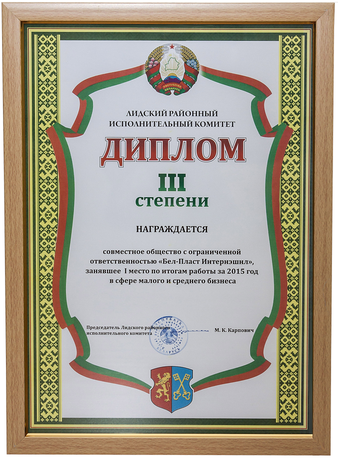 Совместное общество с ограниченной ответственностью "Бел-Пласт Интернэшнл" награждено дипломом III степени за 1 место по итогам работы 2015 года в сфере малого и среднего бизнеса.